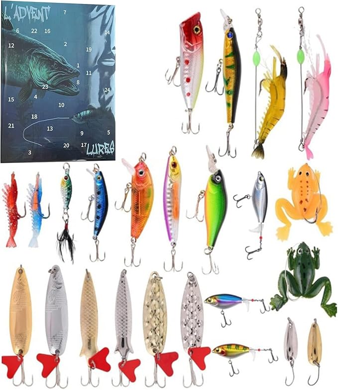 Hinter jedem der 24 Türchen verbirgt sich ein sorgfältig ausgewählter Angelköder – von leuchtenden Wobblern über realistische Gummifische bis hin zu vielseitigen Blinkern. Jeder Köder ist aus robusten Materialien gefertigt, perfekt ausbalanciert und sofort einsatzbereit. Ob du im See, Fluss oder am Meer angelst – dieser Kalender bringt Abwechslung in deine Tackle-Box und steigert deine Fangchancen.